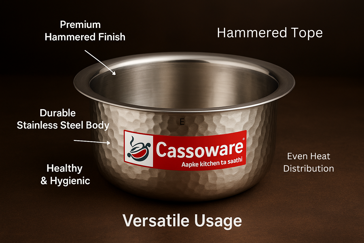 Add elegance and strength to your kitchen with the Cassoware 1.5 mm Hammered Tope, crafted from premium 430 grade stainless steel. Designed with a traditional hammered finish, this tope is perfect for boiling milk, preparing dal, curries, soups, or even for serving directly at the table. Its 1.5 mm thick stainless steel body ensures durability and consistent performance for everyday cooking.