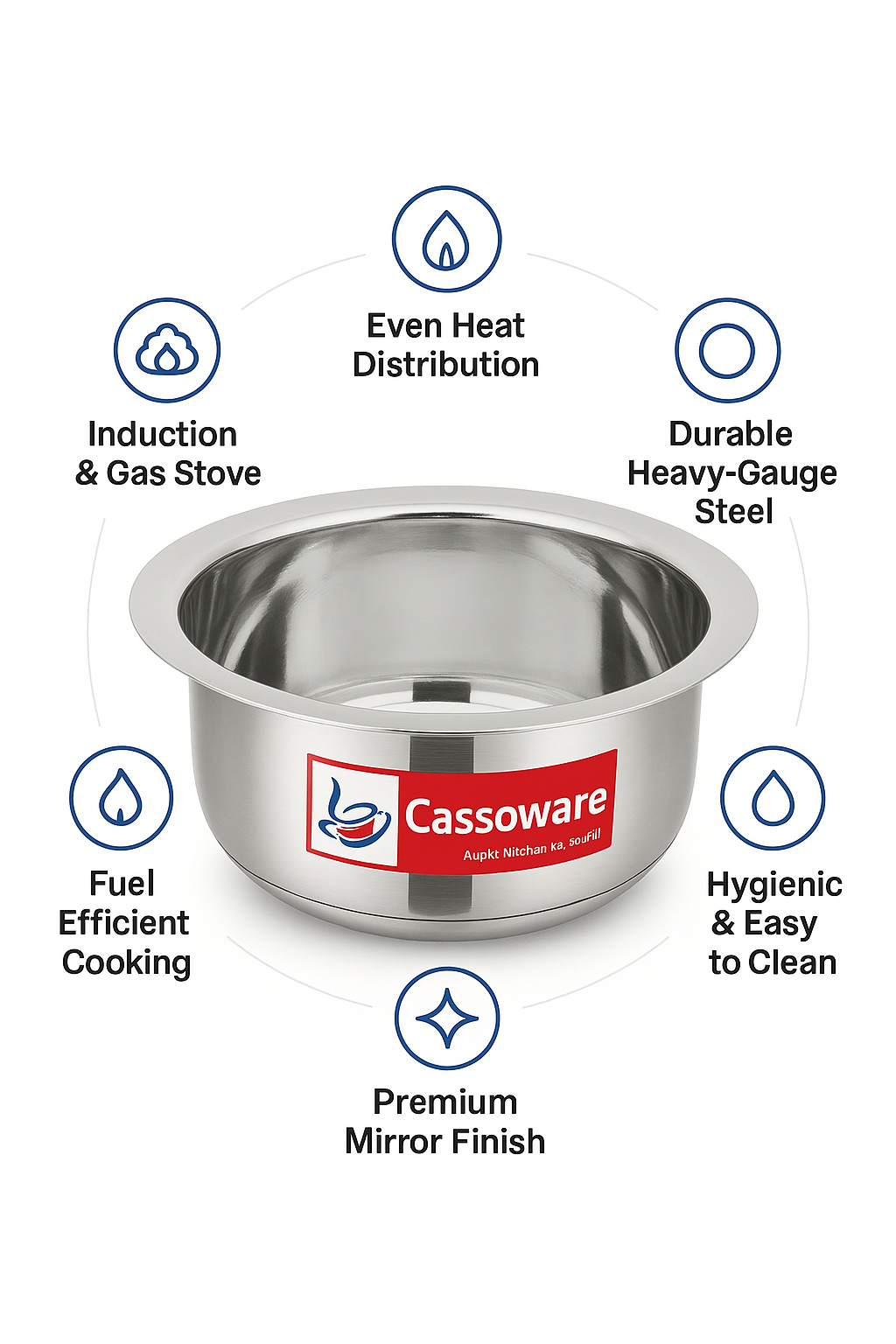 All Cassoware cookware is crafted from high-quality, food-grade stainless steel, ensuring durability, hygiene, and a premium finish.